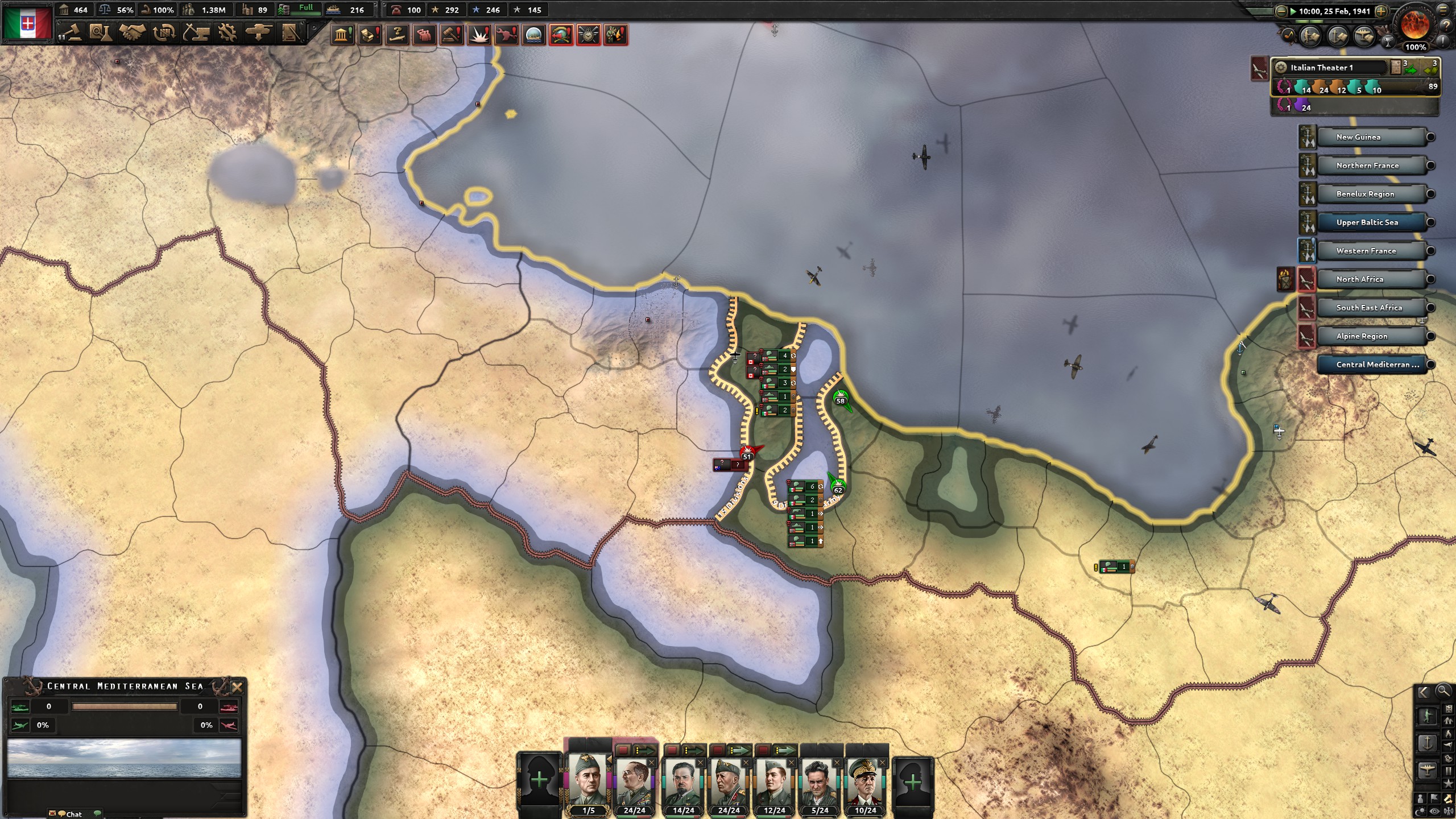 At 1939 the war in Europe exploded. As Italy I persuaded the Balkans and Turkey to join the fascist Axis, while assaulting Great Britain's African territory from my bases in Libya and Ethiopia. In contrast to real life, I conquered the Suez Canal, trapping British forces in Sudan. From there I began a long campaign which stalled out along the Congo River, and just short of the Coast of South Africa. With another Army Group, Italy invaded modern Tunisia and Algeria, pushing to the outskirts of Algiers.