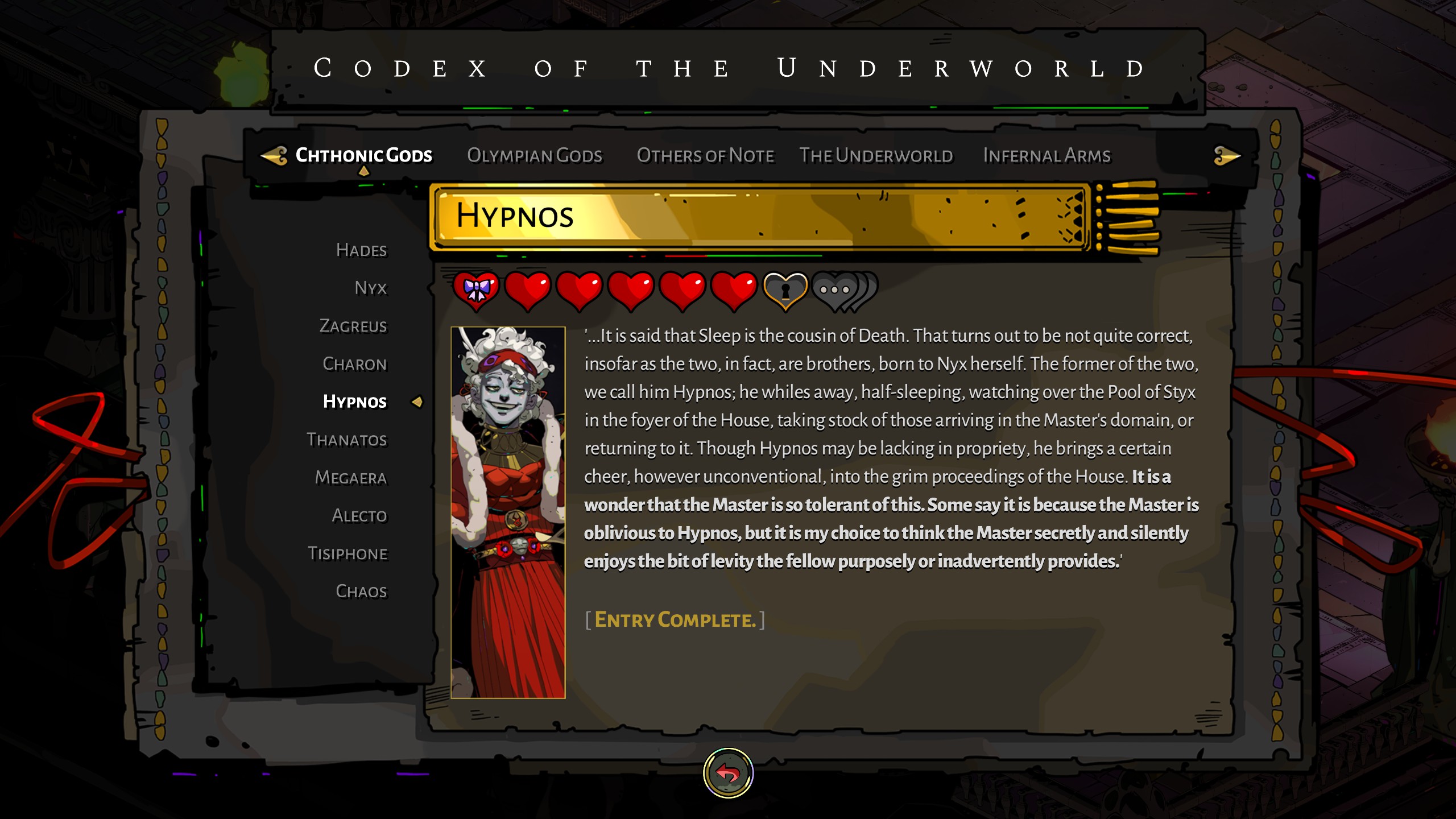 As Gods and souls receive Nectar a bar above their heads fills with hearts. Every recipient drinks five Nectars before they reveal a locked heart. To break past this barrier, Zagreus needs to perform a labor. The labor is unique to the recipient, and it is not named, not explained, and not immediately available for completion. Through dialogue Gods and mortals express their desire.