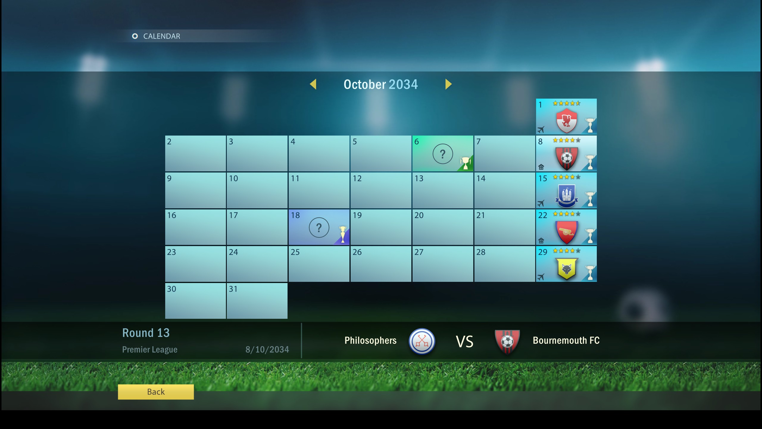 With their starting roster, the player attacks their schedule. A calendar dates all matches in the current season. Winning a game earns the player's team glory, fans, and money. Glory improves the club's trainers and scouts. The number of fans determines the club's income. Players spend money on contracts for characters. Successfully navigating the campaign requires signing contracts and making trades. Characters sign to one, two, or three year contracts. Unlike real life, the money is paid upfront. Oddly, longer contracts seem unusually expensive. Two year contracts cost significantly more than double a one year contract. Why does it cost 100,000 for a two year contract (50,000 a year), vs 40,000 for a single year contract. Perhaps Football, Tactics & Glory assumes a character's value increases rapidly, because their Attributes improve each year.