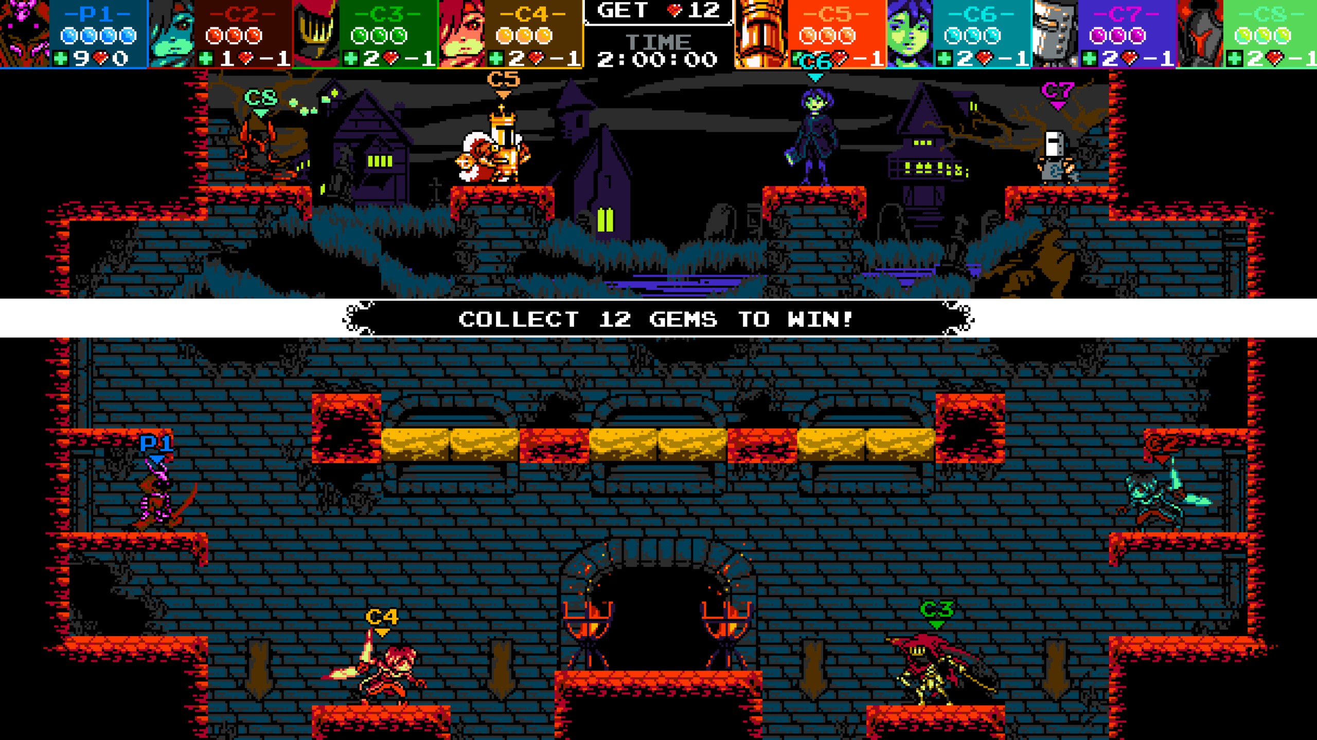 One of the more confusing aspects of combat is the interaction of the many different attacks. Not all attacks are equal. They all inflict one damage, but there is a strange hierarchy of which attack wins if two crash into each other. Some ranged attacks cancel each other upon contact, but that isn't true when two melee attacks collide, like Plague Knight's Staff of Surging (a mobility move that also attacks upwards), vs Black Knight's Shovel Dive (diving downward, shovel point first). My notes say that Plague Knight's attack wins, which seems strange (imagine attacking the point of a shovel with your head – magical sure, but still), but I am now uncertain if the specific angle of attack (or timing) was the reason for the outcome. When hit, a character becomes briefly invulnerable, but unable to pick up gems (they are also knocked back, suffering a temporary moment of paralysis). Different sources of damage seemed to inflict longer or shorter instances of invulnerability. For some characters it seemed possible to land two attacks in quick succession.