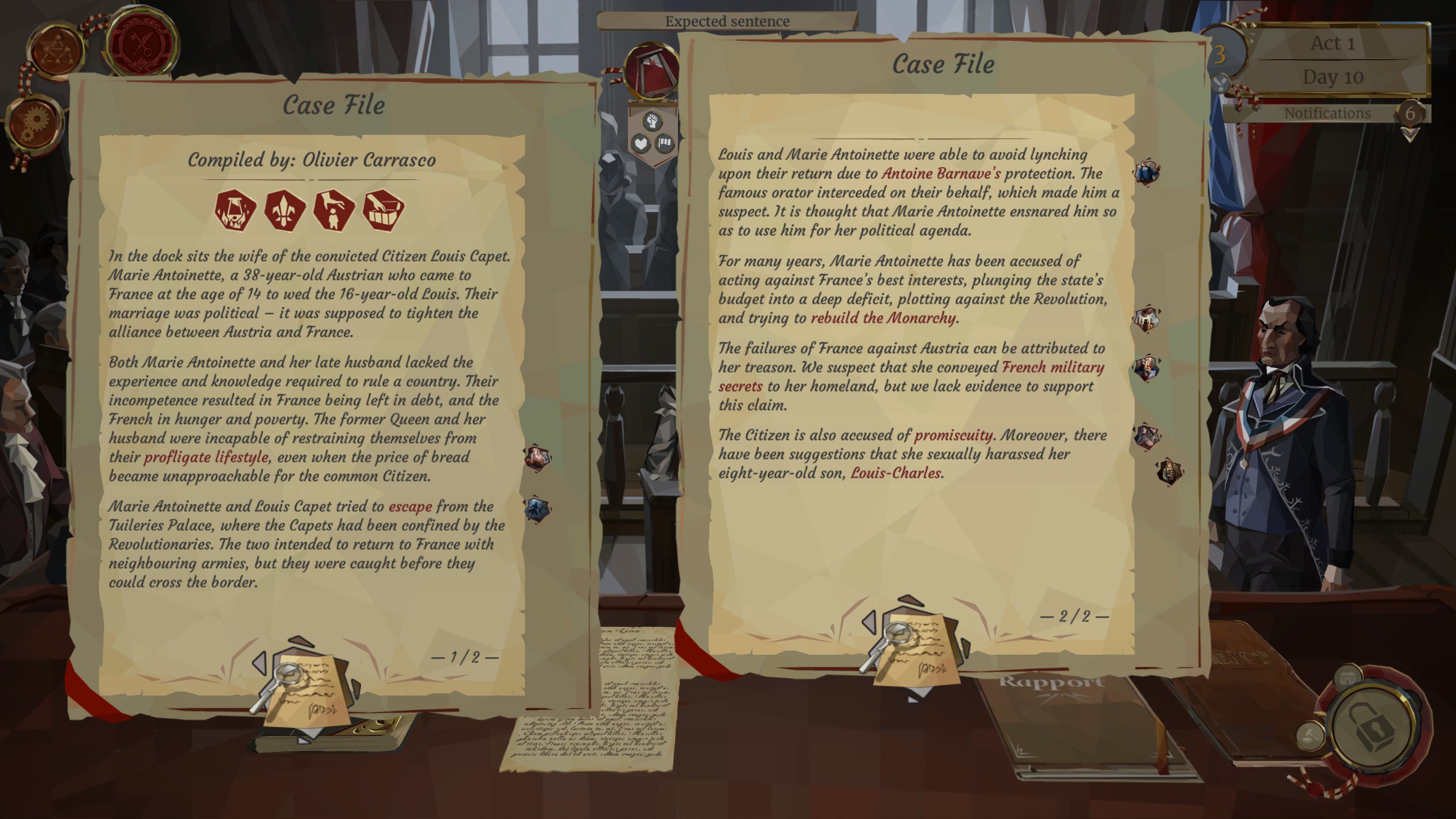 Once the player decides the verdict and manipulates the jury into the same opinion, it's time to sign the paperwork. The game asks, is the accused guilty? But it doesn't ask what they are guilty of. In a trial, a person is accused of a particular crime. This criteria remains open ended in We. The Revolution. The files at the beginning of the trial list a number of possible crimes, but the game never specifies the accusation. That's ok, since there are only three possible outcomes; acquittal, imprisonment, or execution by guillotine. On the fifteenth day, We. The Revolution removes imprisonment, leaving Alexis only two options; liberty or death. It also introduces quick cases. These have no questions, no jury, no witnesses, only a series of one sentence cases. The player must decide them with limited information. The decisions impact the opinion of the factions, but less than a normal case. That's good, since the player can't see in advance how the factions will react. After a decision, it is finalized with a signature. The player can't erase their signature once affixed to paper.